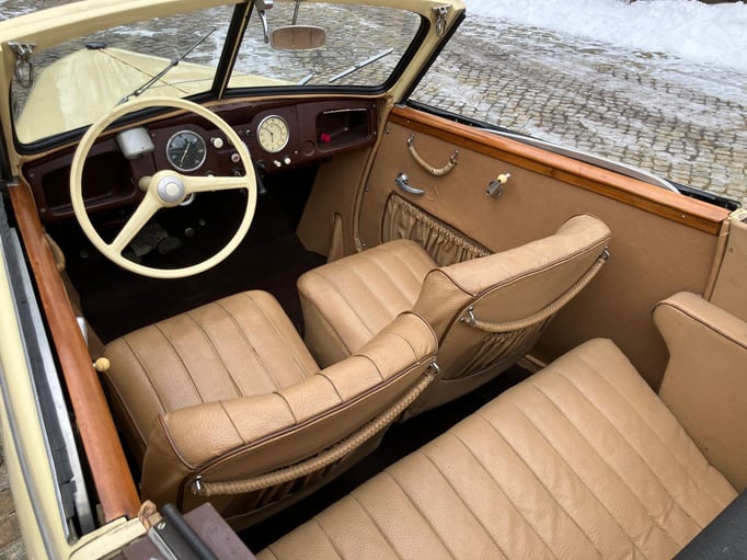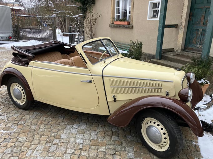Wir bieten Ihnen diesen fahrbereiten und grundsoliden DKW / IFA F8 Cabrio an. Der Wagen wurde vor einigen Jahren restauriert und hat mittlerweile einige Gebrauchs- und Nutzungserscheinungen. Der Motor läuft gut, die Elektroanlage funktioniert auf 12V. Der Wagen hat einen bundesdeutschen KFZ-Brief.
